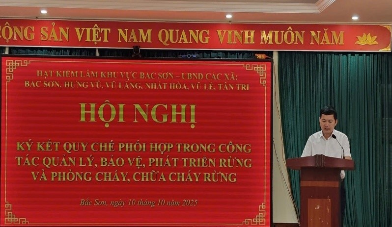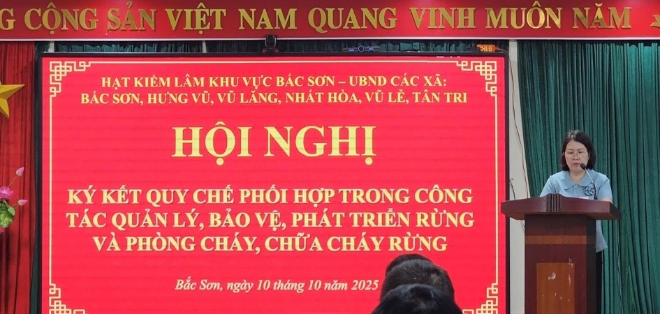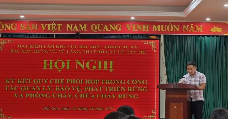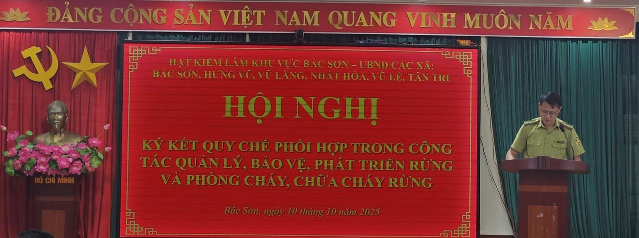 Chiều ngày 10/10/2025, Hạt Kiểm lâm khu vực Bắc Sơn tổ chức Hội nghị ký kết Quy chế phối hợp giữa Hạt Kiểm lâm khu vực Bắc Sơn với UBND các xã: Bắc Sơn, Hưng Vũ, Vũ Lăng, Nhất Hòa, Vũ Lễ, Tân Tri trong công tác quản lý, bảo vệ, phát triển rừng và phòng cháy chữa cháy rừng. Tham dự và chỉ đạo Hội nghị có đồng chí Nguyễn Hữu Hưng, Chi cục trưởng Chi cục Kiểm lâm tỉnh Lạng Sơn; lãnh đạo UBND các xã; đại diện lãnh đạo các cơ quan: Phòng Kinh tế xã, Công an xã, Ban Chỉ huy Quân sự xã, cùng với sự tham dự của các đồng chí Lãnh đạo, công chức trong đơn vị Hạt Kiểm lâm khu vực Bắc Sơn.